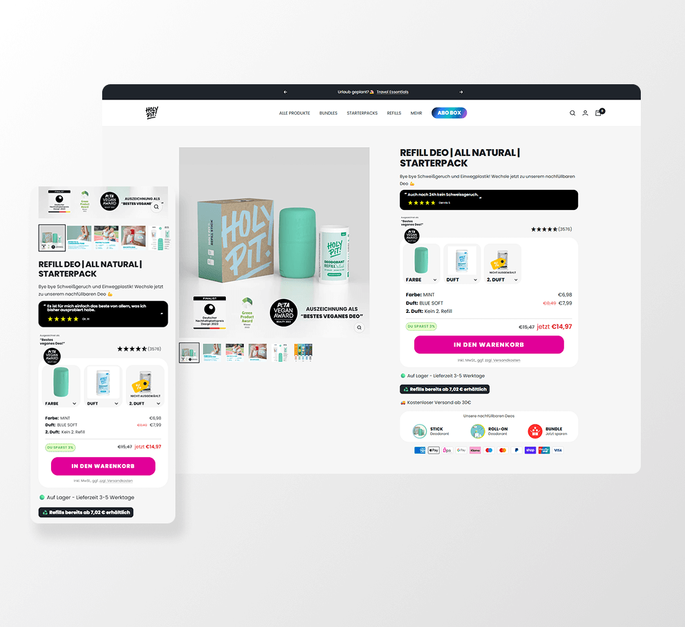 A modern personal care brand challenging traditional deodorant positioning. The product page was optimized through A/B testing to refine messaging and improve conversion performance.